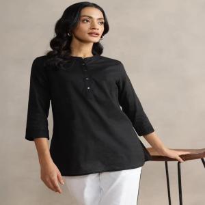 Minimalist by nature, this short cotton kurta is designed for the modern wardrobe. The Chinese placket and crisp straight fit create a sleek profile, while the waist-length cut pairs perfectly with printed trousers or wide-leg jeans. Add wooden bangles or a jute tote for a balanced mix of comfort and statement.