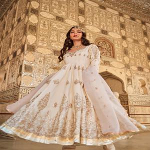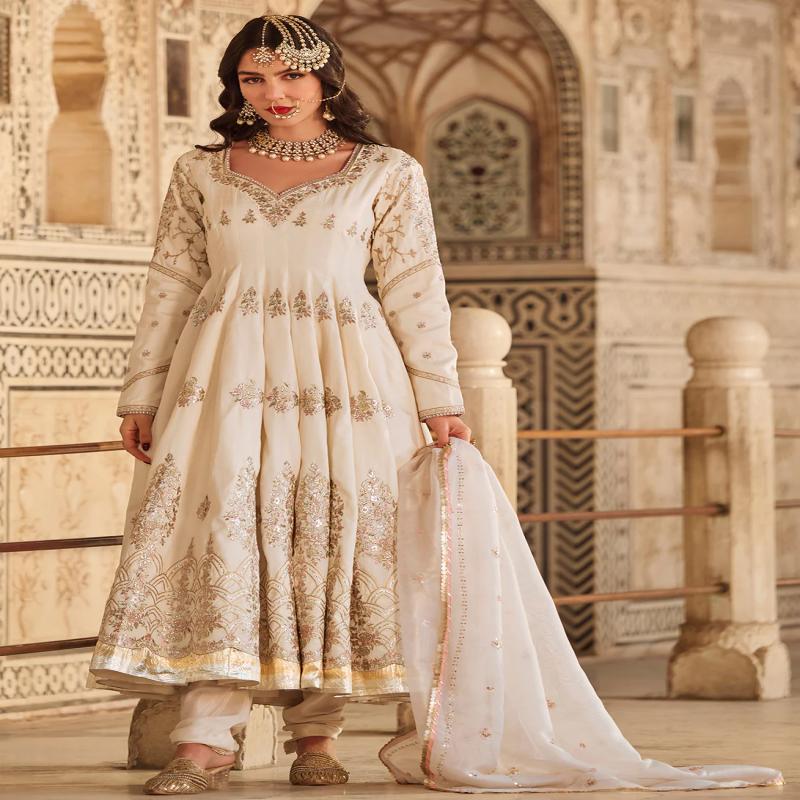 Our Ivory Embroidered Silk Anarkali includes a silk top with santoon inner, santoon bottom, and an organza dupatta. Embroidery is present on this style using zari, sequins, and hand work.