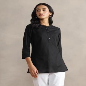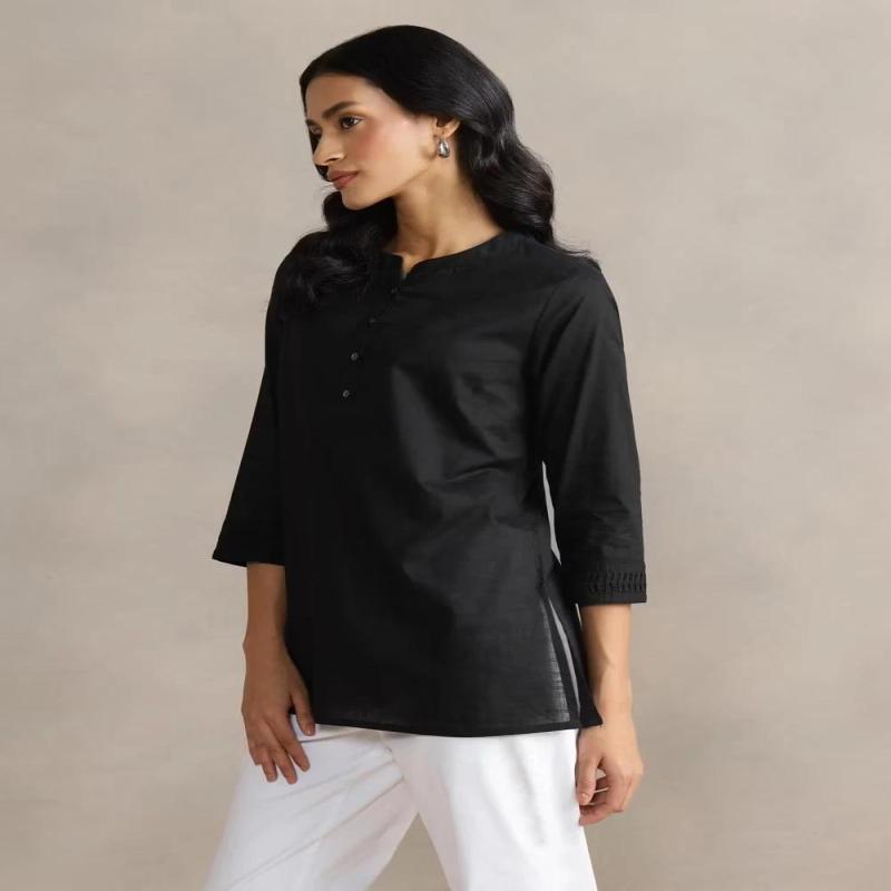 Minimalist by nature, this short cotton kurta is designed for the modern wardrobe. The Chinese placket and crisp straight fit create a sleek profile, while the waist-length cut pairs perfectly with printed trousers or wide-leg jeans. Add wooden bangles or a jute tote for a balanced mix of comfort and statement.