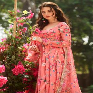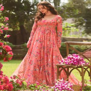 Our Coral Multicolor Floral Printed Anarkali includes a silk top with crepe inner, crepe bottom, and an organza dupatta. Embroidery is present on this style using zari, sequins, and thread work.