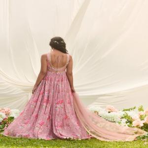 Our Dusty Pink Multicolor Floral Printed Anarkali includes an organza top with santoon inner, santoon bottom, and a net dupatta. Embroidery is present on this style using zari, sequins, and thread work.