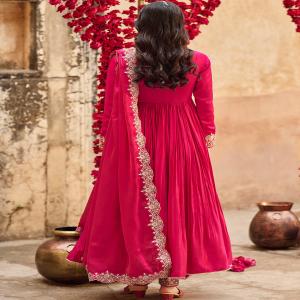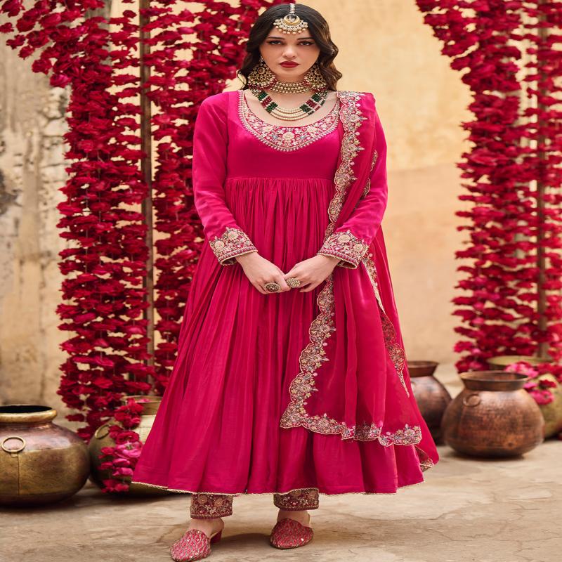 Our Hot Pink Embroidered Satin Anarkali includes a satin top with santoon inner, santoon bottom, and an organza dupatta. Embroidery is present on this style using zari, sequins, and hand work.