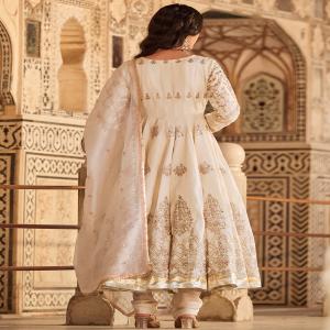 Our Ivory Embroidered Silk Anarkali includes a silk top with santoon inner, santoon bottom, and an organza dupatta. Embroidery is present on this style using zari, sequins, and hand work.